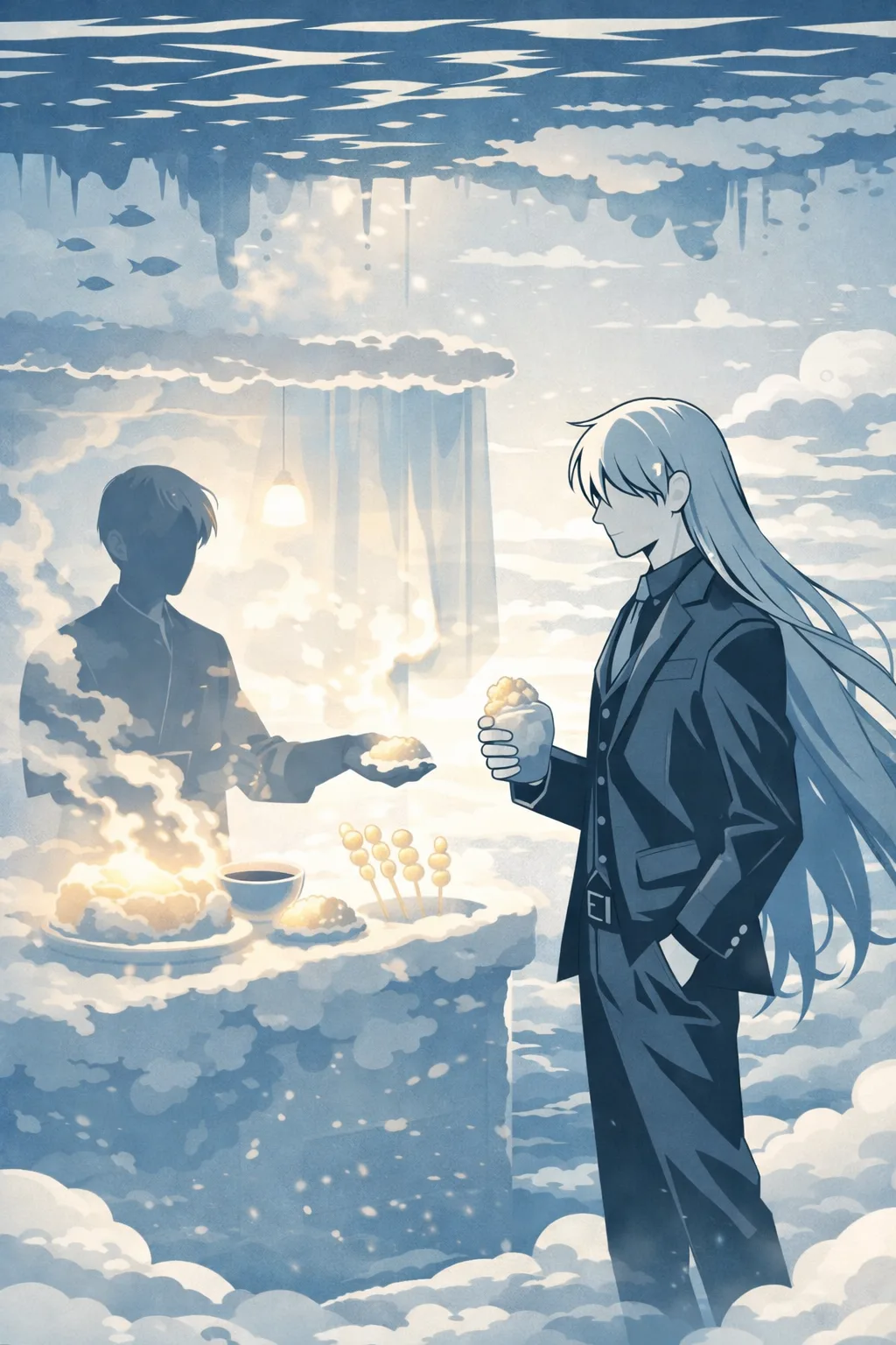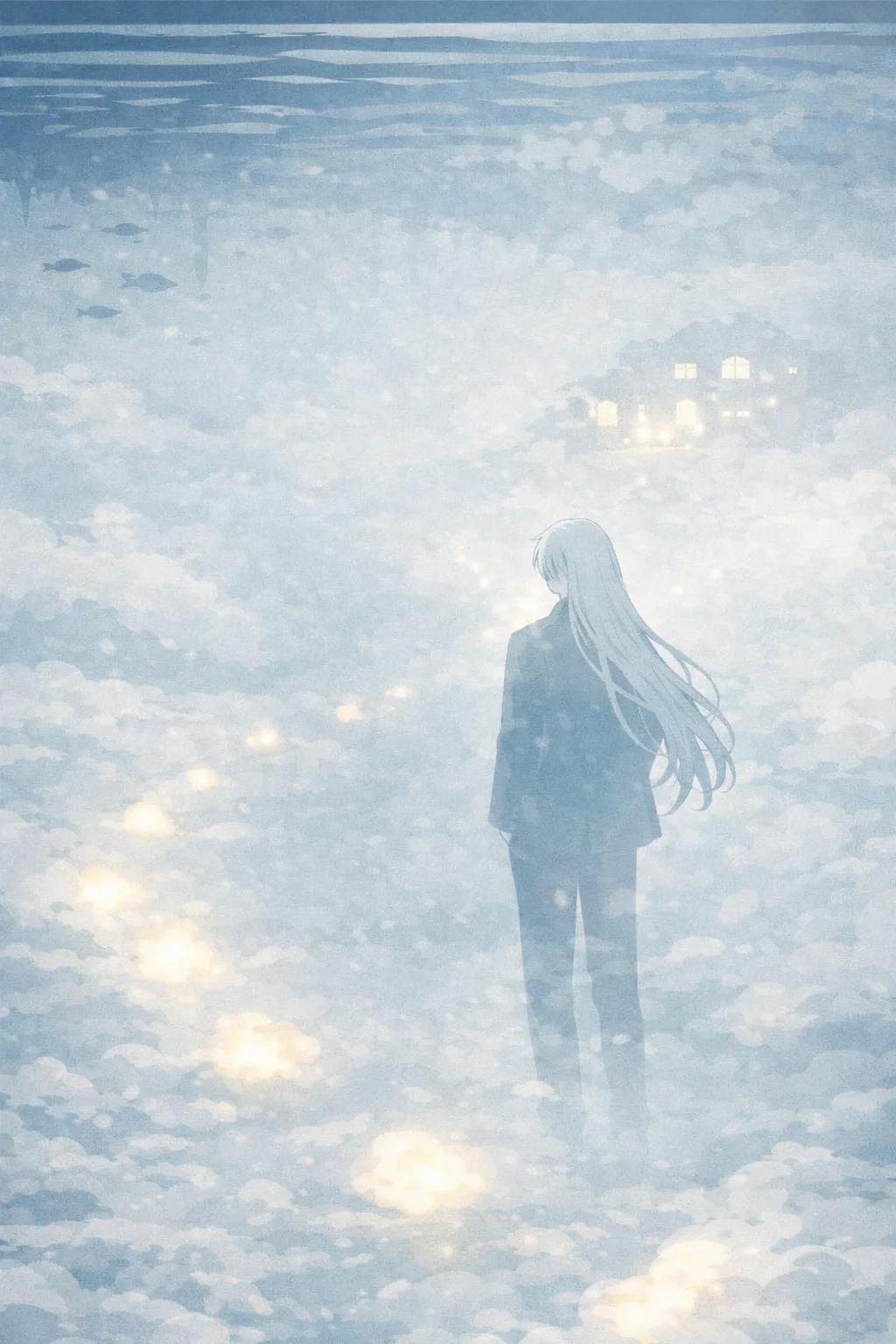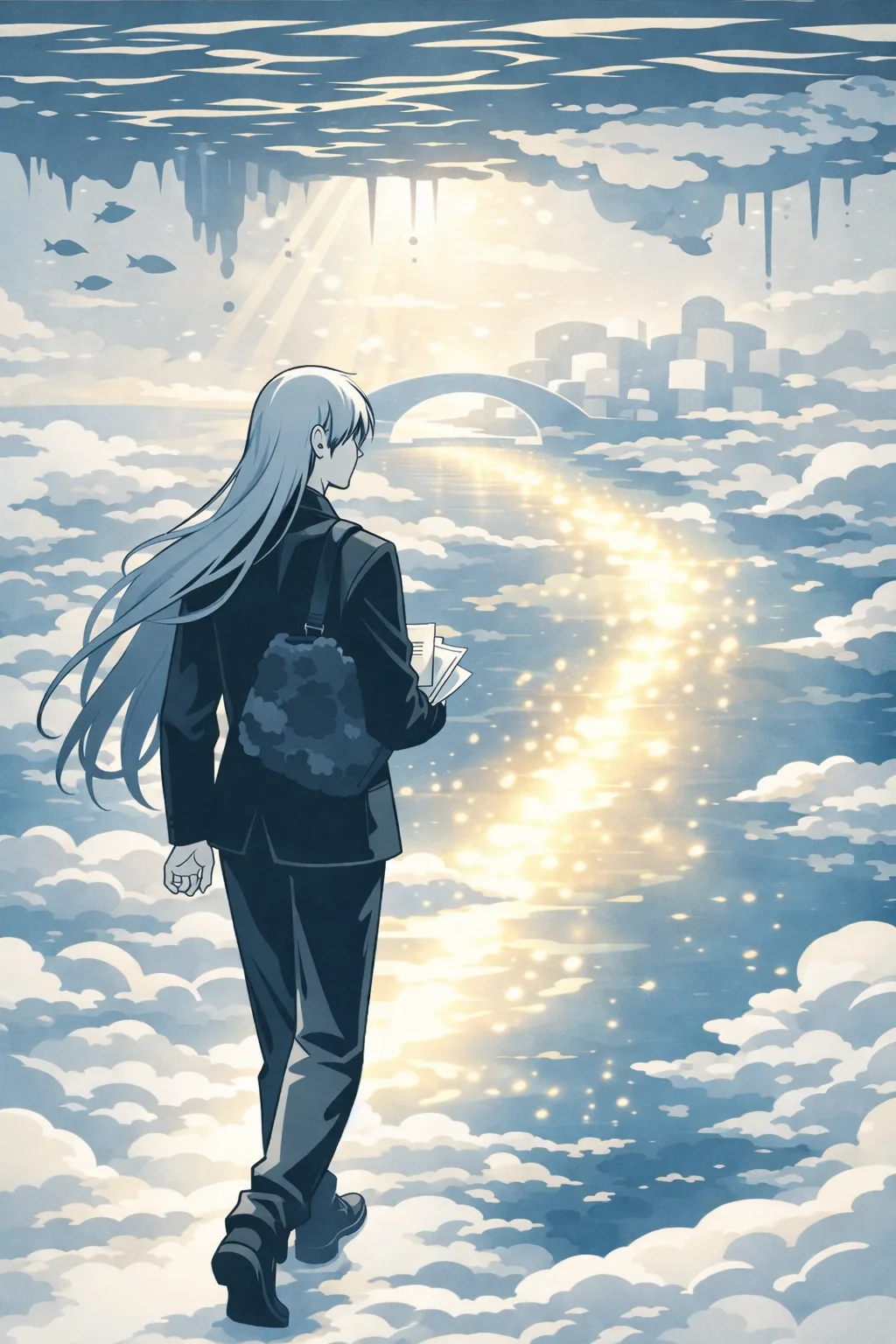 这里的重力是反的。或者说,这里的「下」是那片海。所有的东西都在被轻轻地往上拉——云絮从脚下飘起来,像水底的气泡缓缓上升,触及海面后便化作一圈泡沫。而海里的水不会掉下来,因为在这个世界里,水的重力方向朝上,正如同云的重力方向朝下。