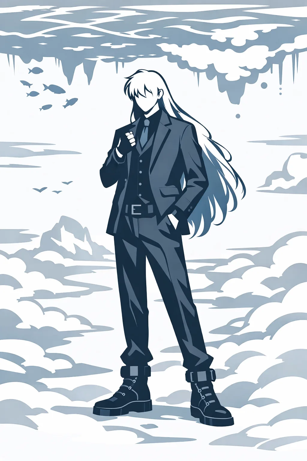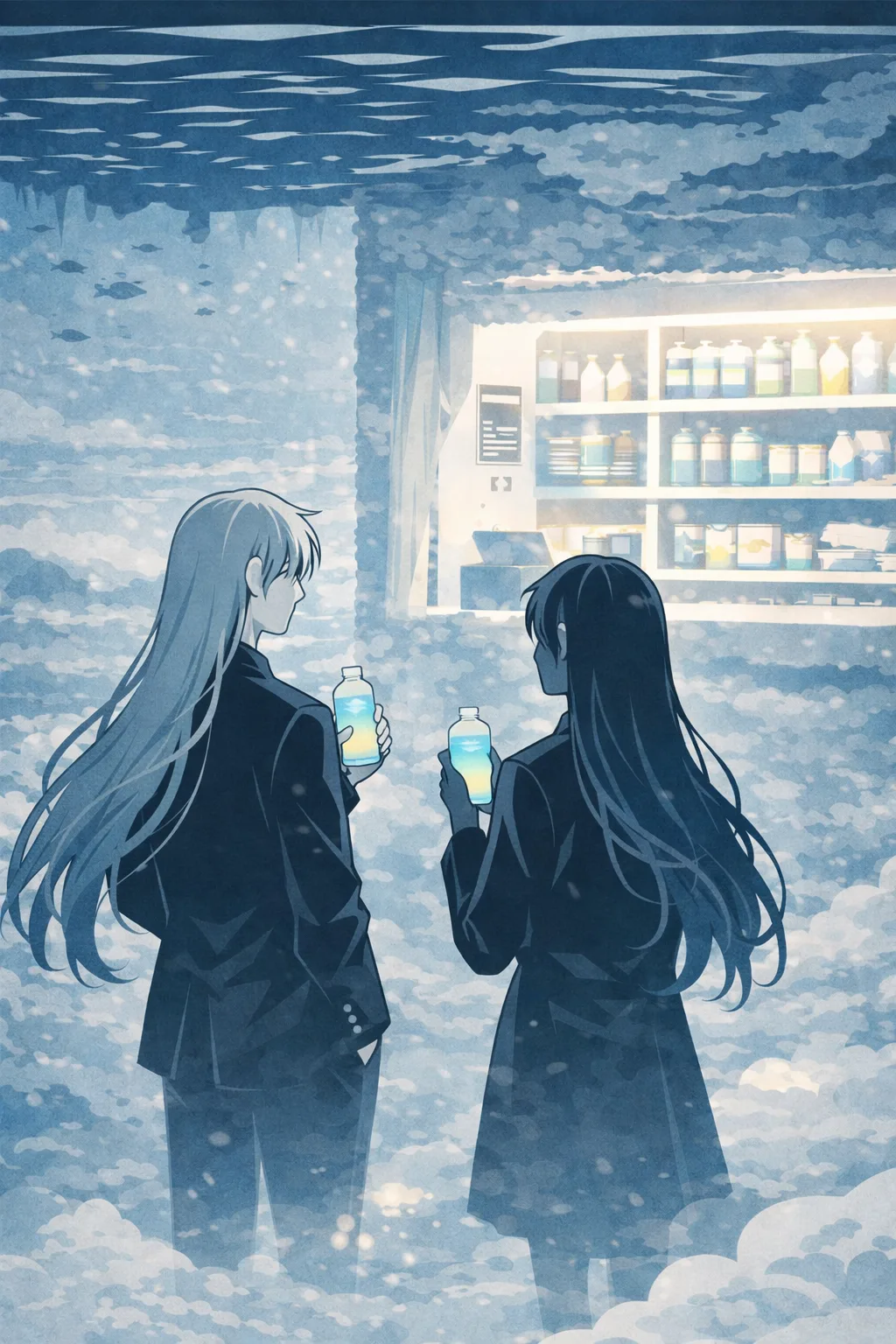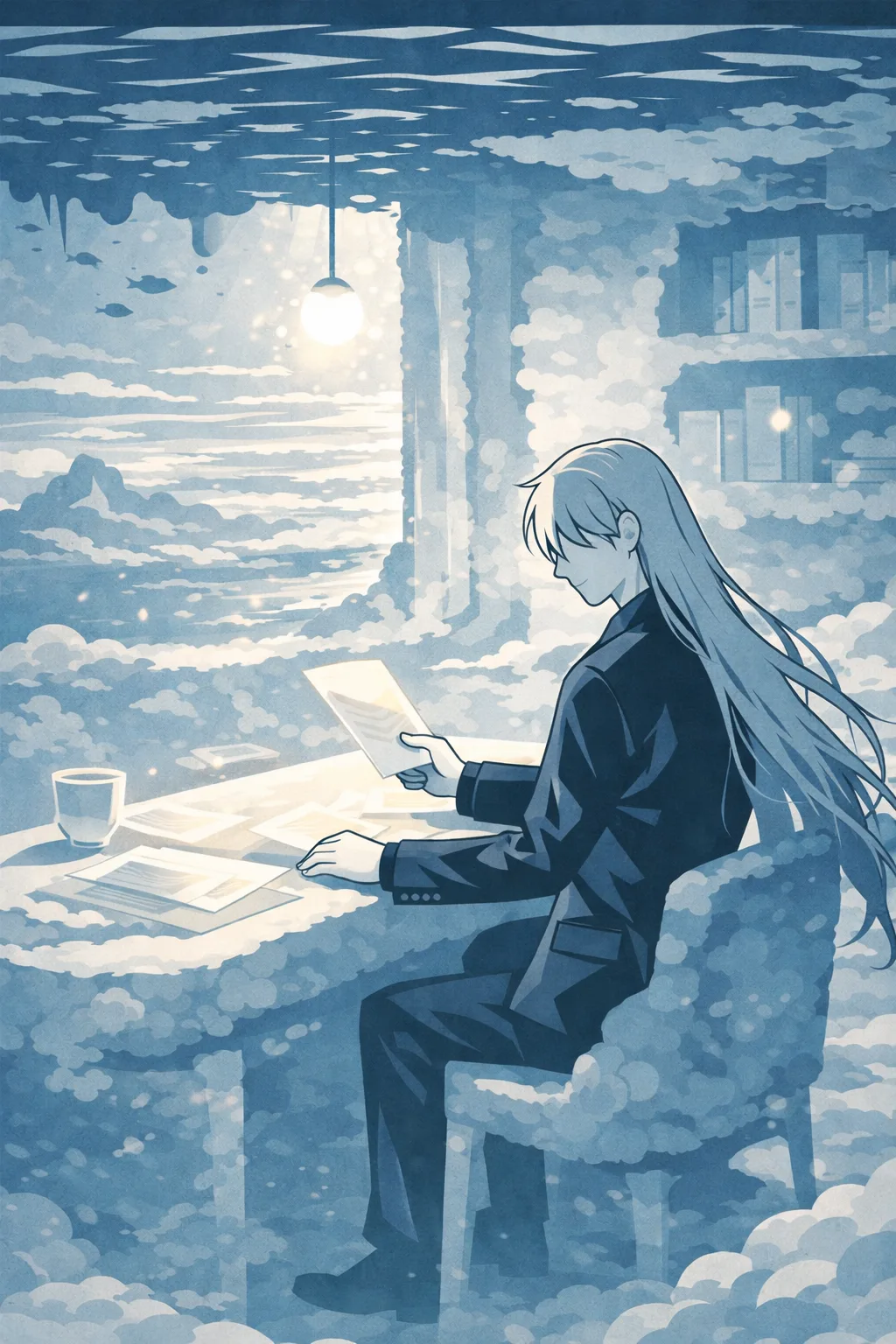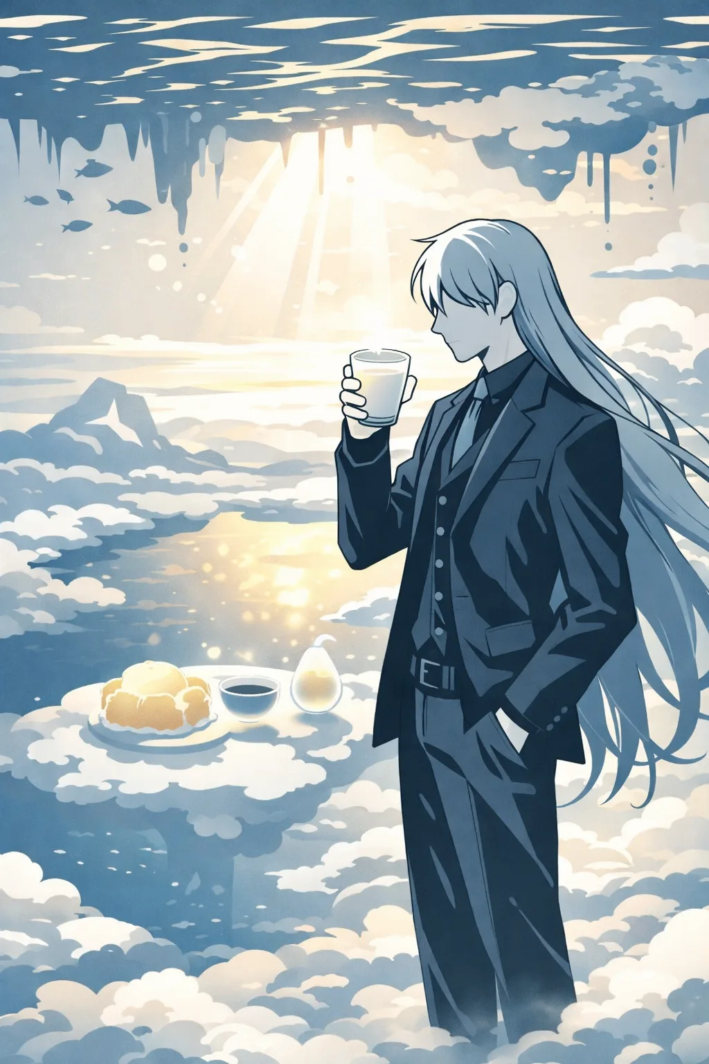 这里的重力是反的。或者说,这里的「下」是那片海。所有的东西都在被轻轻地往上拉——云絮从脚下飘起来,像水底的气泡缓缓上升,触及海面后便化作一圈泡沫。而海里的水不会掉下来,因为在这个世界里,水的重力方向朝上,正如同云的重力方向朝下。