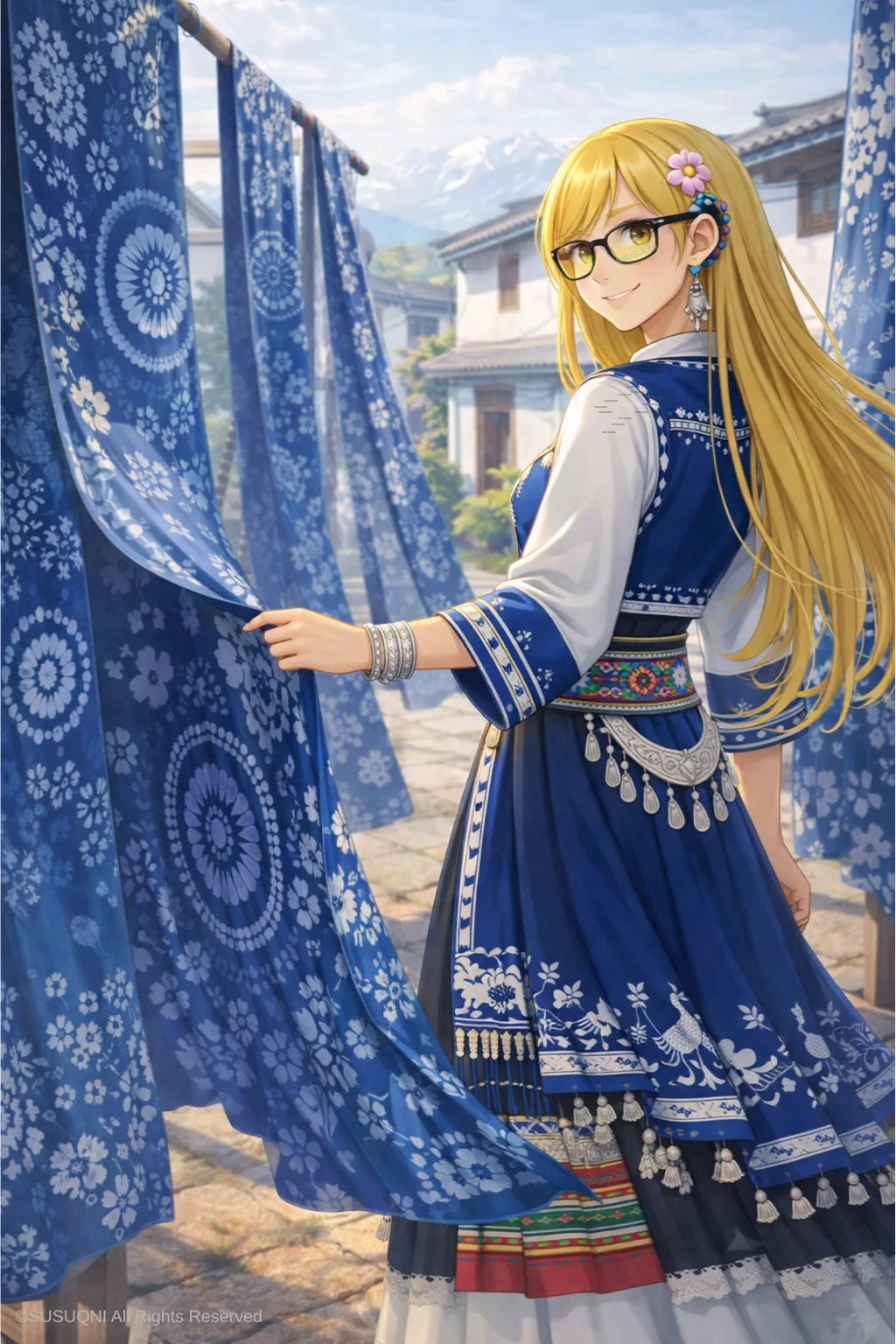 周城是大理扎染的核心村落。走进去,几乎家家户户的院子里都晾着蓝白相间的布匹,在风中轻轻摆动,像无数面写满了花纹的旗帜。蓝与白,这两种颜色在大理无处不在:苍山的雪是白的,洱海的水是蓝的,白族民居的墙是白的,门窗上的彩绘底色是蓝的。扎染不是被「发明」出来的,是被这片山水养出来的。