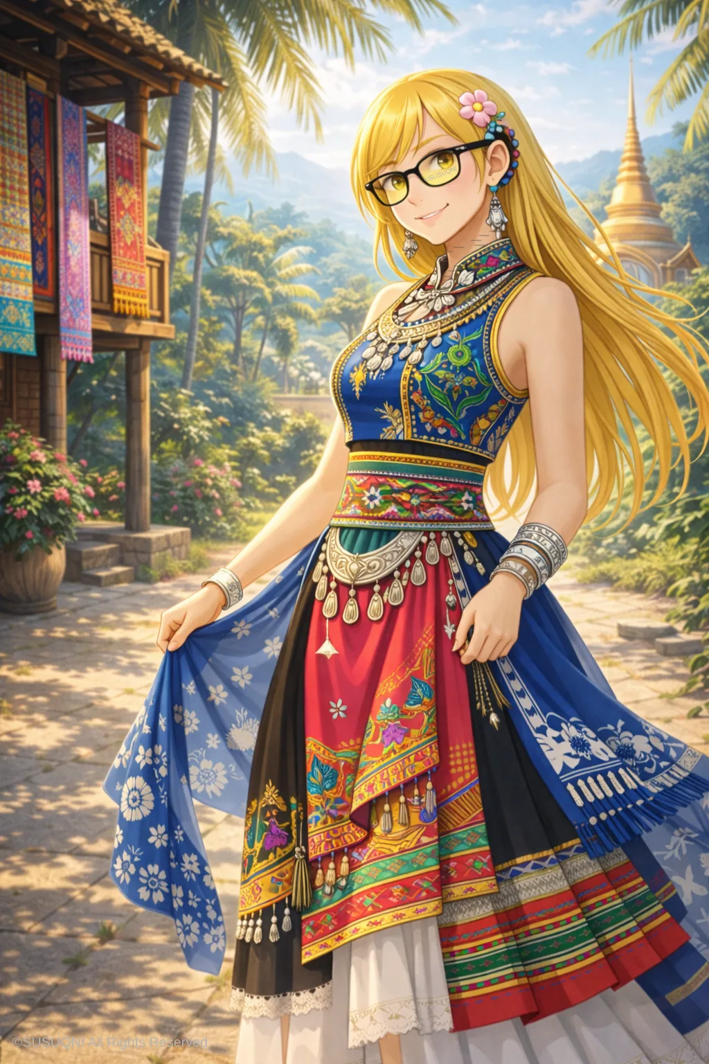 空气变得潮湿而温热,路两旁是高大的棕榈和凤凰木,阳光透过叶片落在地上,碎成一地金斑。傣族世界的色彩比白族浓烈得多——他们的织锦用的是亮丽饱和的颜色,孔雀尾羽般的蓝绿、芒果般的金黄、三角梅般的玫红,织进筒裙、披肩和包布里,穿在身上像一座移动的热带花园。