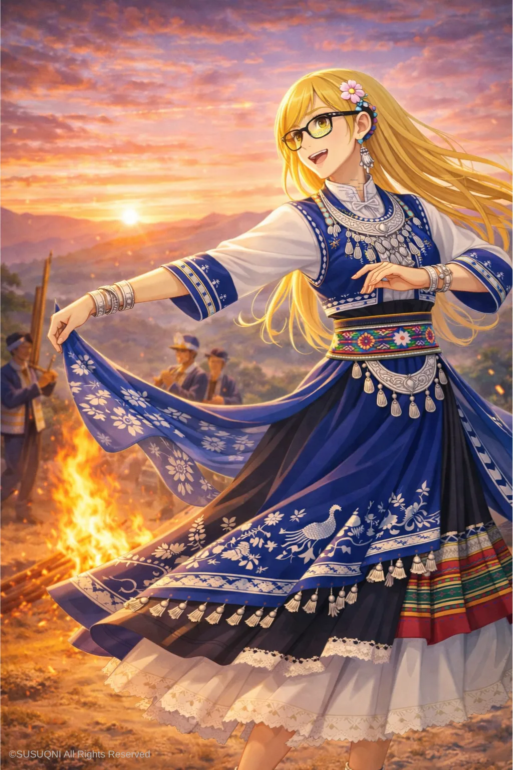 在云南的村寨里,傍晚不是一天的结束,而是另一种生活的开始。广场上的篝火升起来了,穿着盛装的人聚到一起——彝族的烟盒舞最先跳起来,舞者手持烟盒,以指尖叩击盒面,发出清脆而有节奏的声响,脚步在地上踏出一种大地般沉稳的韵律。
